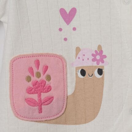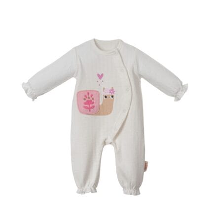 Sevimli salyangoz figürüyle bebeğinizin tarzını tatlı bir şekilde tamamlayan Salyangoz Figürlü Kız Bebek Tulum, hem konforlu hem de şık bir seçenek!