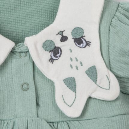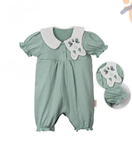 Tavşan Yakalı Kız Bebek Tulum, şirin tavşan yaka detayı ve doğal Nil Yeşili rengiyle bebeğinizin şıklığını ve rahatlığını ön plana çıkarır.
